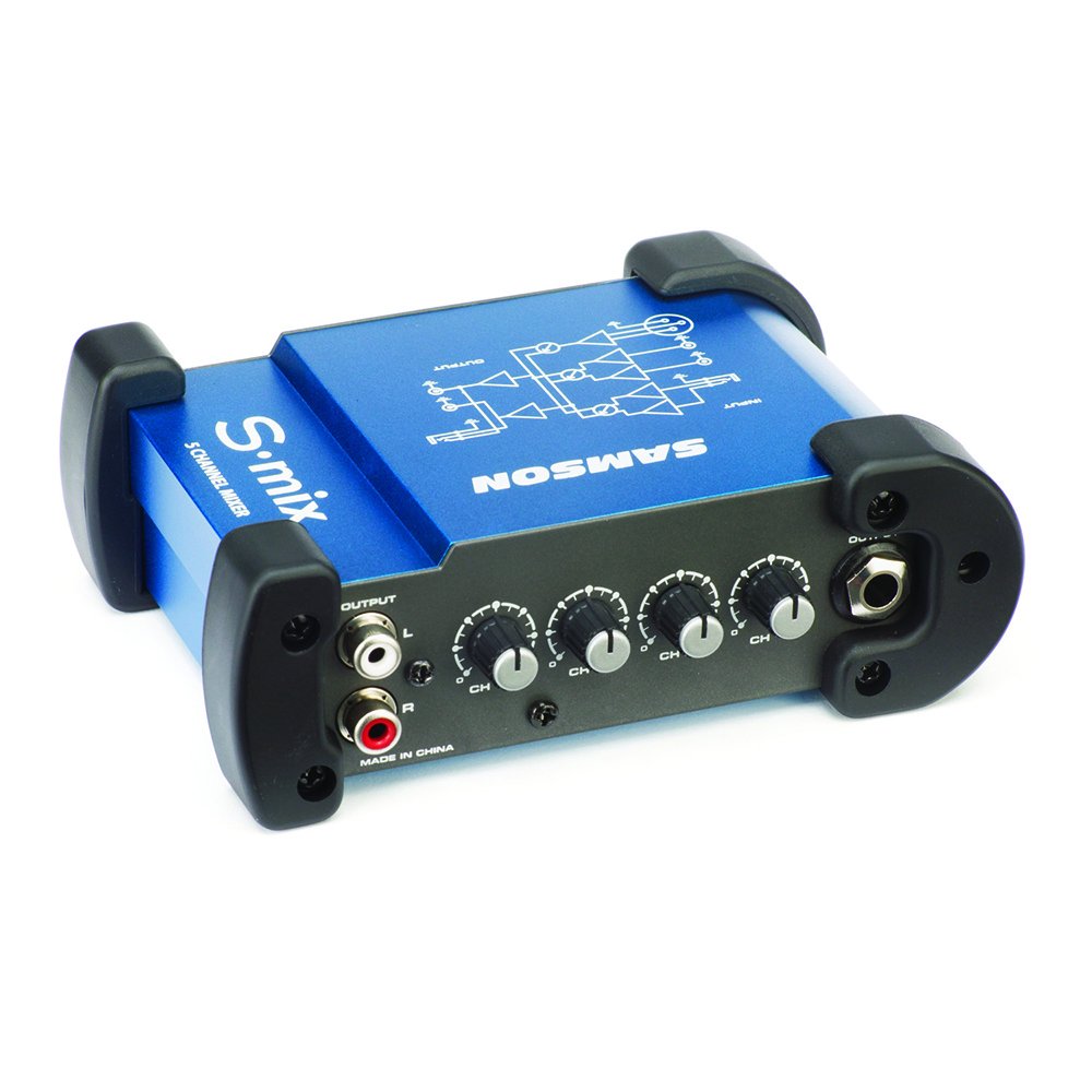 Image: Samson S-Mix 5-Channel Compact Mixer. This image displays the compact mixer with its various input and output jacks, along with the individual volume control knobs for each channel.