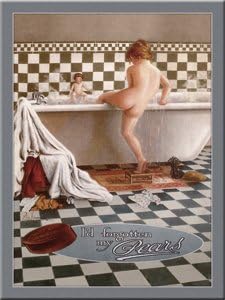 This image displays the front of the N-A Pears Soap steel fridge magnet. It features a classic Pears Soap advertisement, showing a young child in a bathtub, with the phrase 'I'd forgotten my Pears' prominently displayed. The magnet has a rectangular shape and a multi-color design, reflecting the vintage estético.