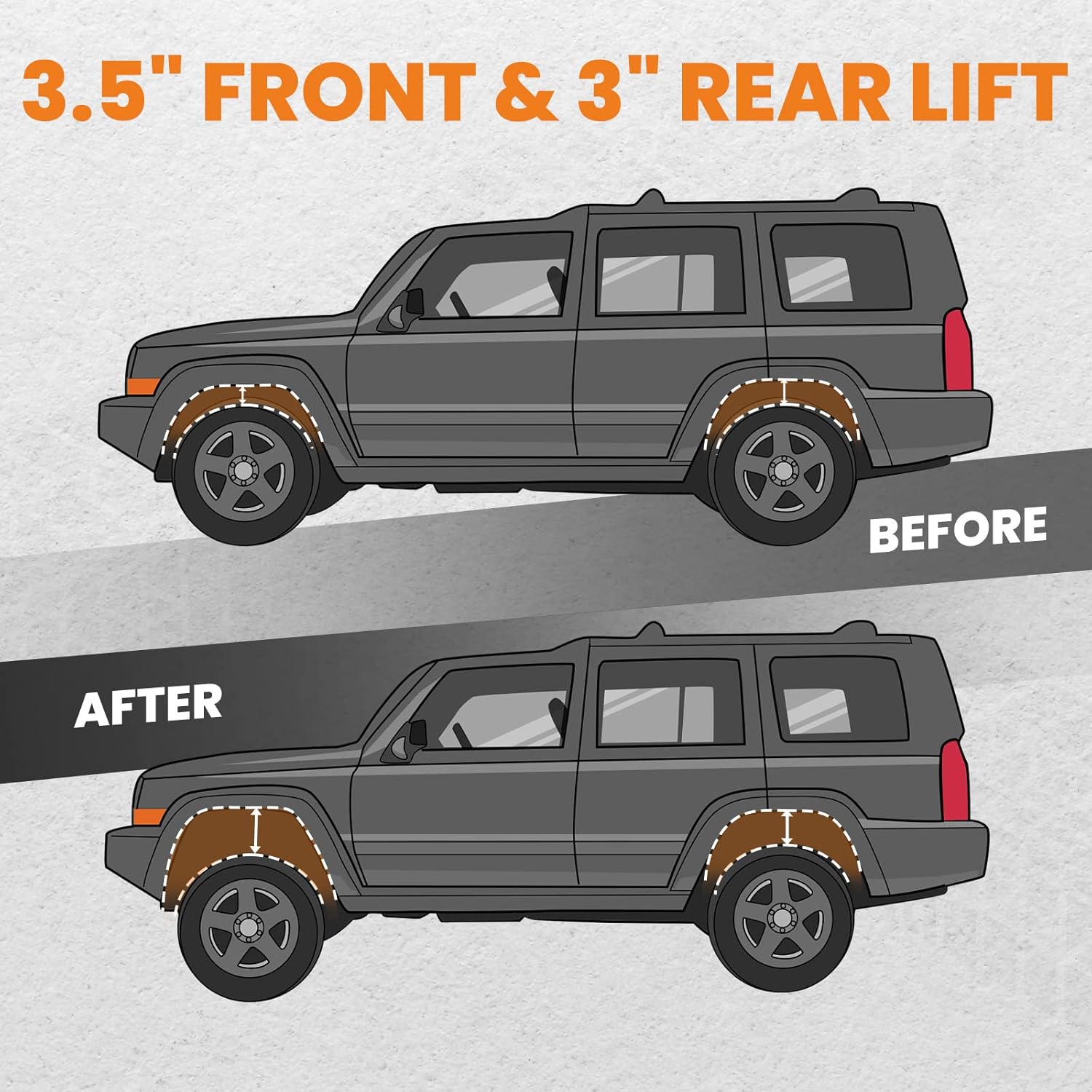 Image: Visual comparison of a Jeep Grand Cherokee before and after the installation of the 3.5" front and 3" rear leveling kit, illustrating the increased ride height.