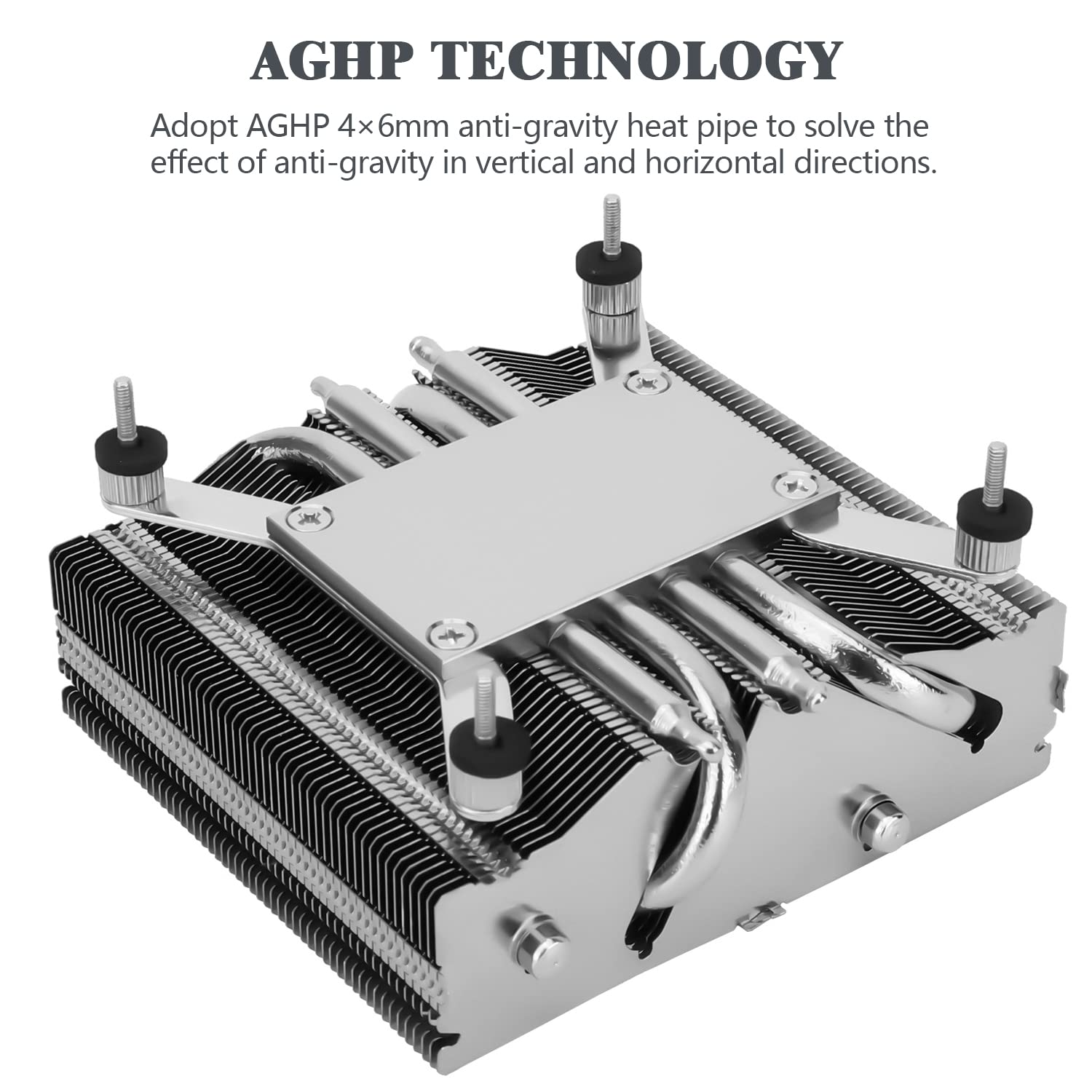 Imagem: The base of the AXP-90 X53 cooler, highlighting the AGHP (Anti-Gravity Heat Pipe) technology for efficient heat transfer in various orientations.