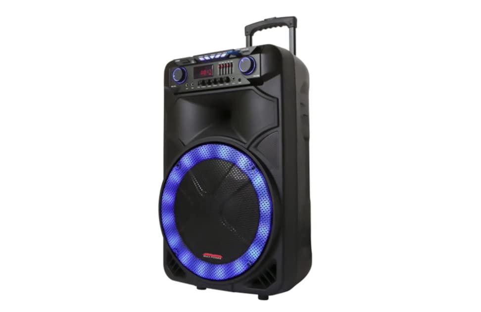 Descrição da imagem: This image displays the front of the Max Power MPD15EQ speaker. It features a large 15-inch woofer at the bottom, a 5-inch horn tweeter above it, and a control panel with an LED display screen. The speaker grille covers the woofer and tweeter, and the overall design is robust and portable.