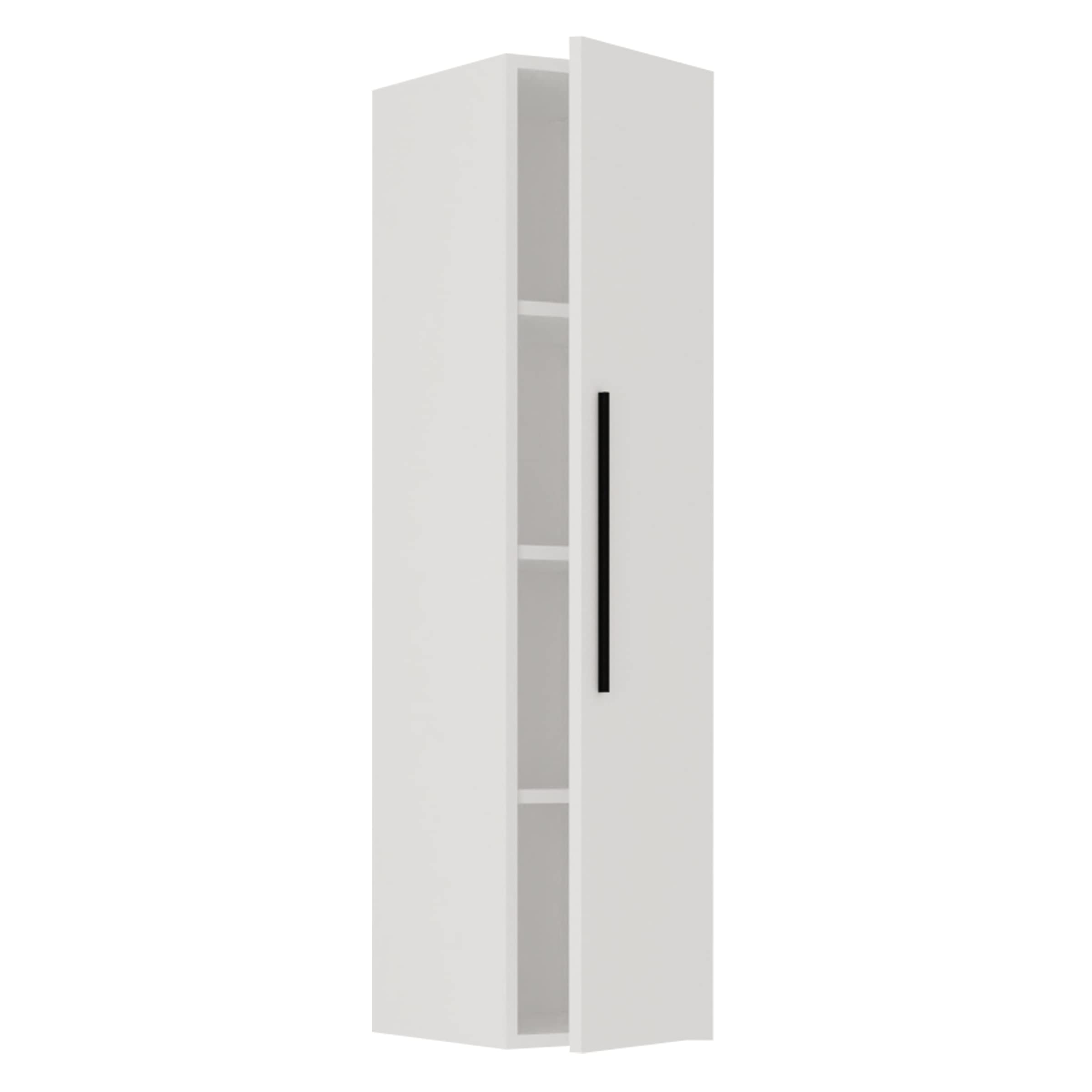 Image 1: Assembled VCM Arila XL Vertical Wall Shelf in white. This image shows the complete wall shelf with its clean, modern design and a single vertical handle on the door.