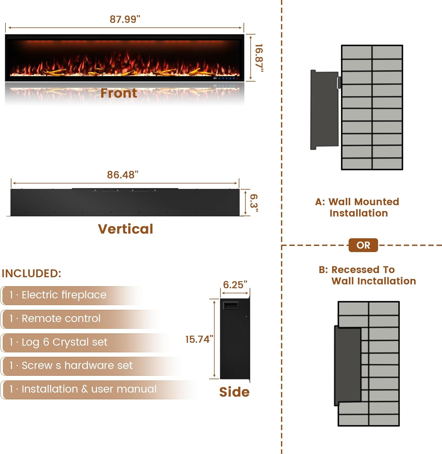 This electric fireplace offers a luxurious experience with realistic log and crystal flame effects, adjustable flame colors, and multiple control options including Wi-Fi, remote control, and a touch screen panel. It is designed for both wall-mounted and recessed installations, providing warmth and ambiance to your living space.