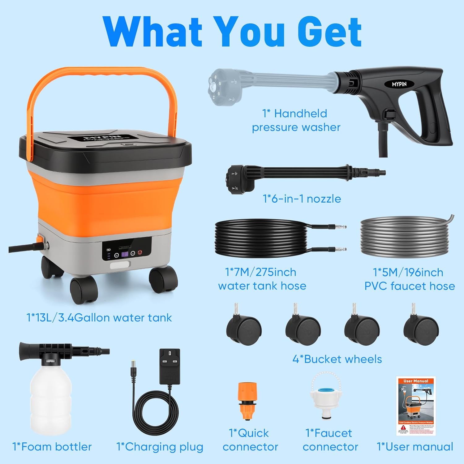 Figura 1.1: All components included in the MYPIN Cordless Electric Pressure Washer package.
