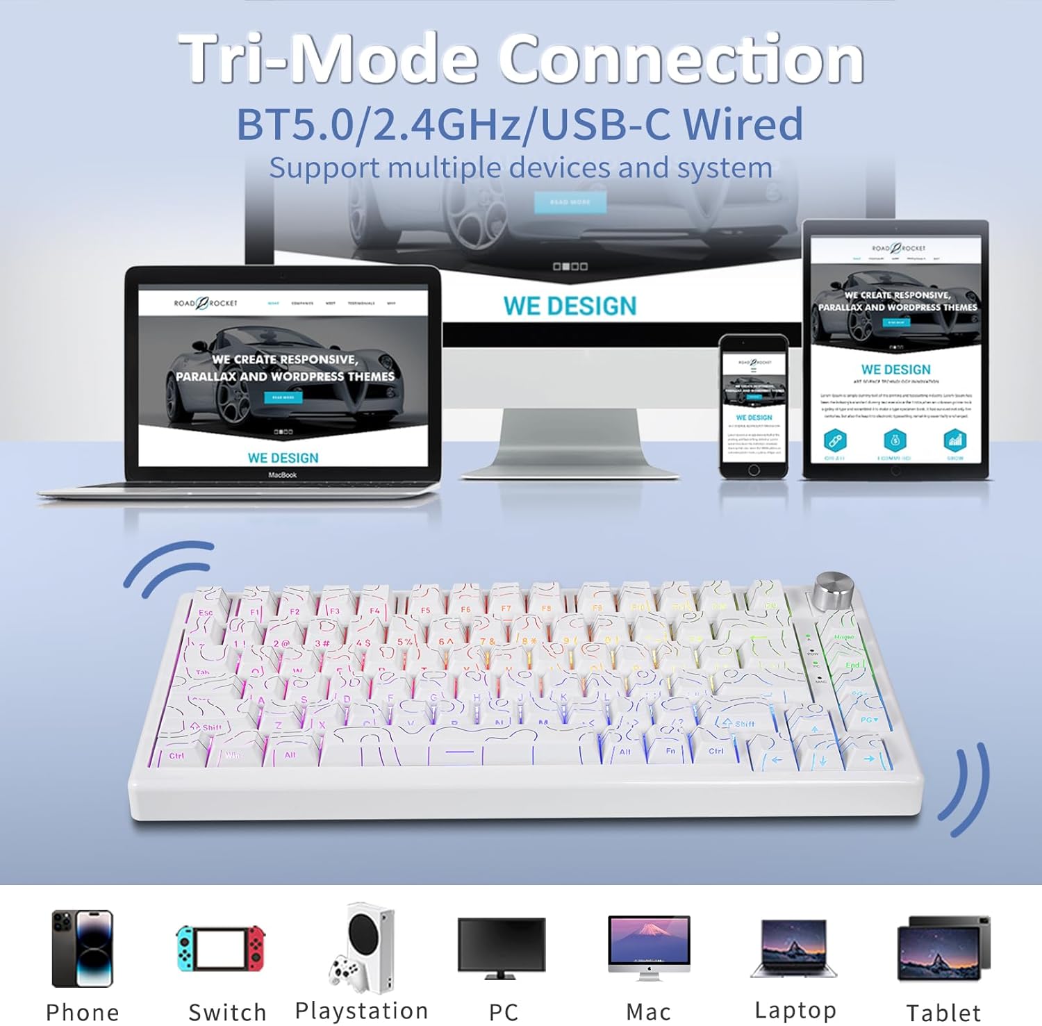 Image: The HUO JI CK621 keyboard demonstrating its versatile tri-mode connection capabilities, including wired, 2.4GHz, and Bluetooth, compatible with various devices like PCs, Macs, laptops, phones, and gaming consoles.