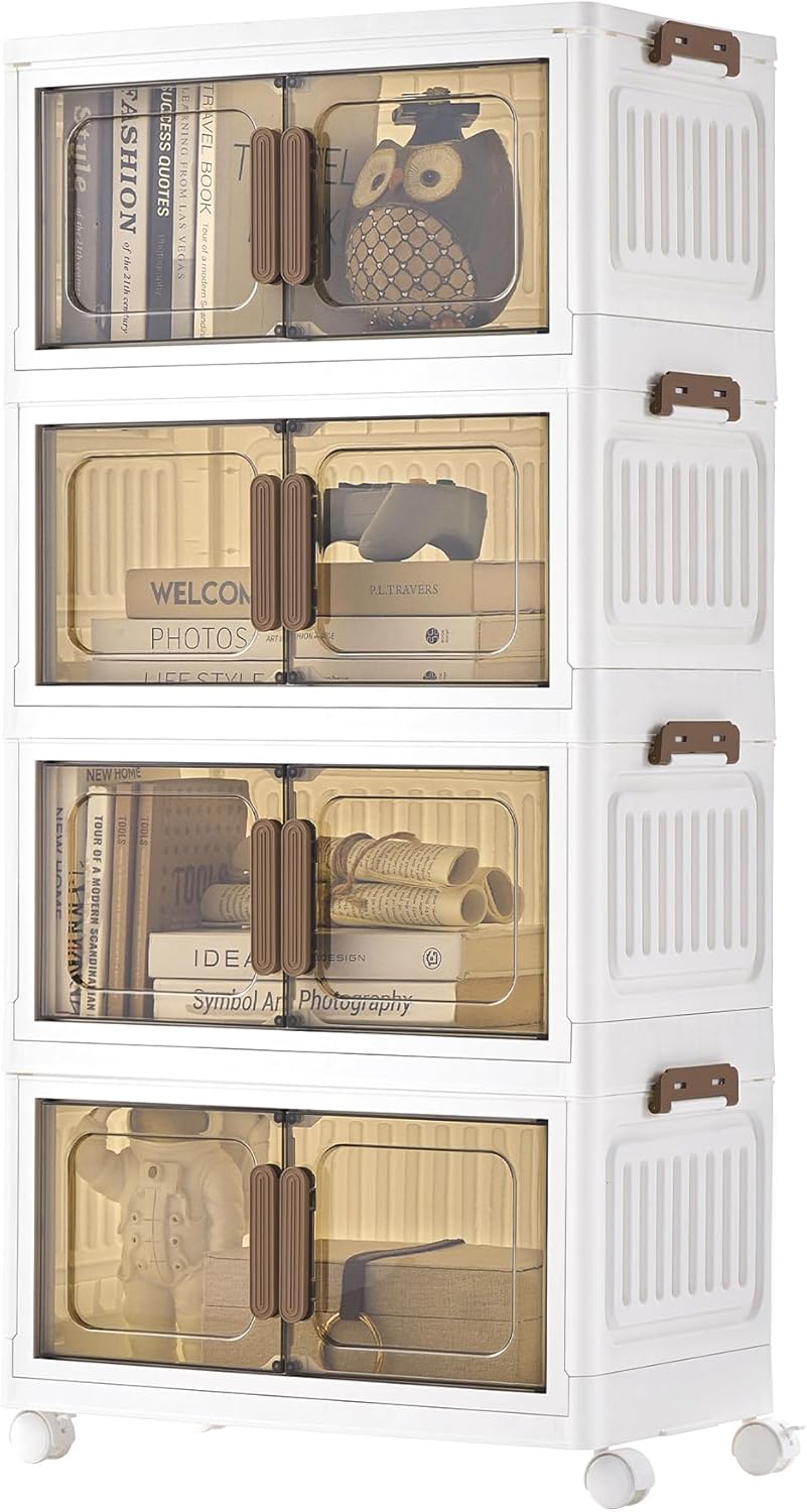 Each storage box features a magnetic double door, allowing convenient access to contents even when the boxes are stacked. Simply pull the handles to open the doors. The magnetic closure ensures the doors remain securely shut without opening unintentionally.